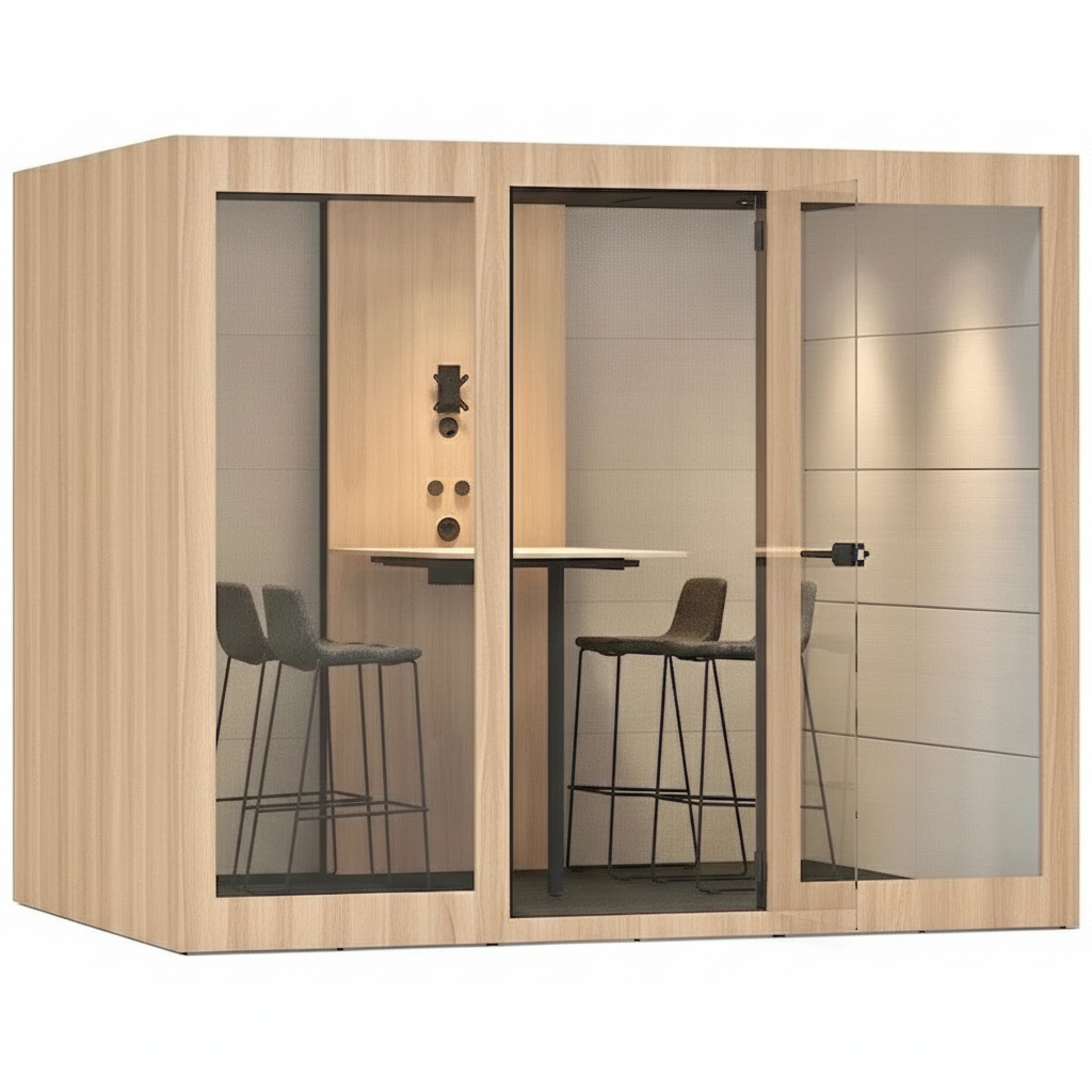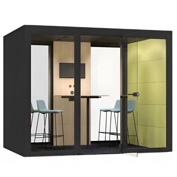 Stillerommet er bygget med solide materialer som MDF melamin, step melange stoff og metallprofiler for økt stabilitet og akustisk demping. Bakveggen består av en midtre vegg med stoff eller glass på begge sider. Alle glassdetaljer er laminert med pulverlakkert aluminiumsramme og PVC-tetning. Stofftypen for dette stillerommet har en mer levende overflate med fargespill. Step melange har også høy slitestyrke (over 100.000 Martindale, noe som betyr at det tåler mye bruk). Det er også brannsikkert, noe som gjør det ideelt for kontorer og offentlige rom.