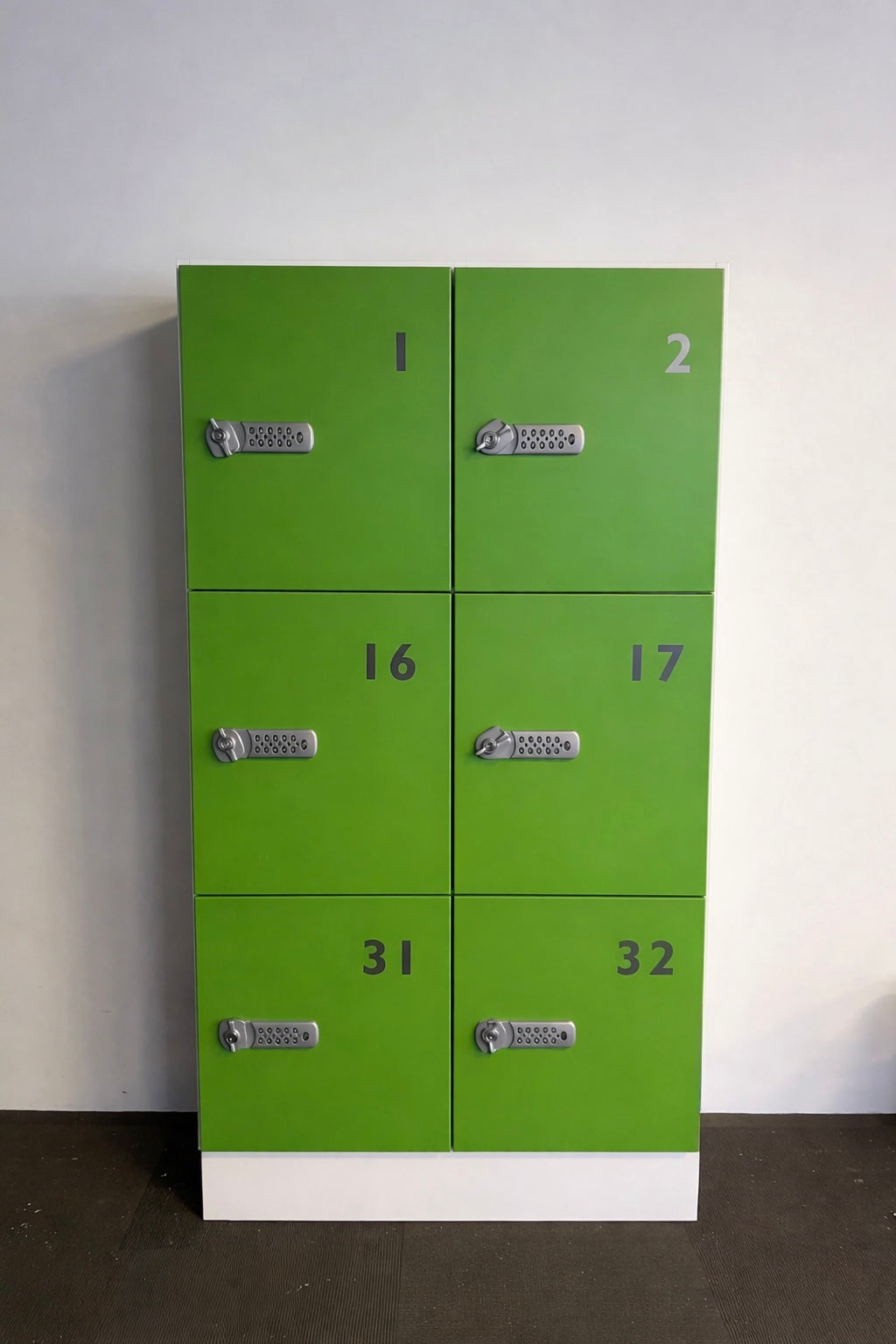 Dette praktiske skapet med 9 forskjellige rom gir full funksjonalitet med stil. Skapet er konstruert med et slitesterkt laminat, noe som gir en solid og elegant "finish" samtidig som det er enkelt å vedlikeholde. Den moderne grønnfargen på skapdørene skaper et lyst og oppmuntrende miljø i ethvert lokale. Kodelåsen er enkel å konfigurere for ethvert bruk med personlig kode på 4 sifre.