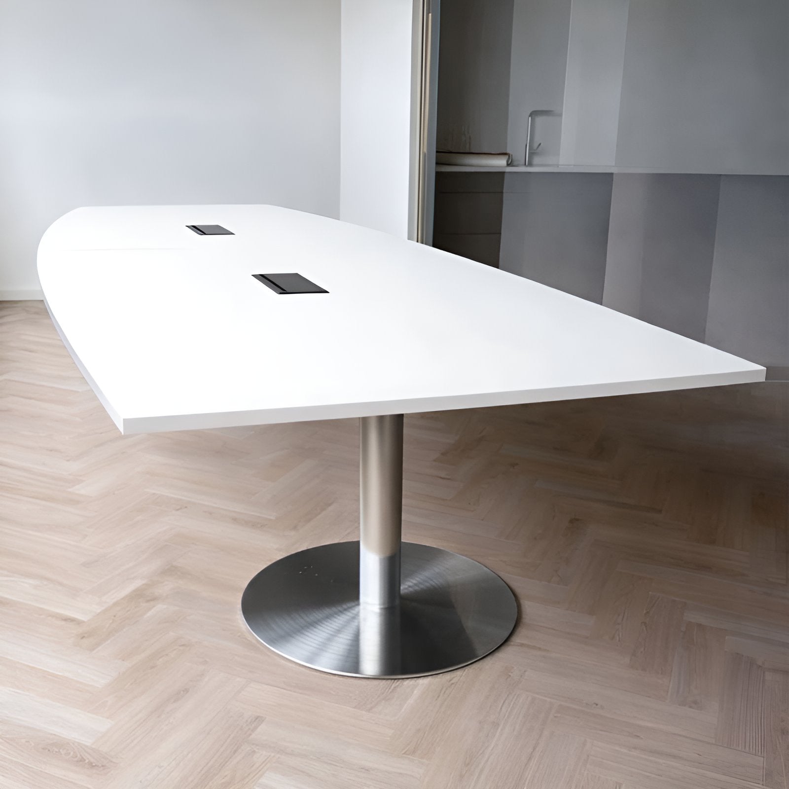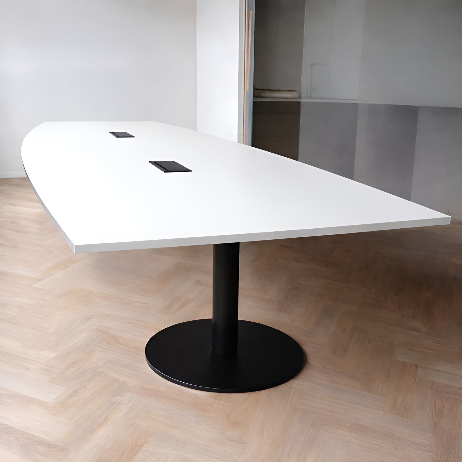 Dette imponerende møtebordet en ideell løsning for møterom, kantiner og konferanseområder. De kraftige og robuste søylene gir svært stabil støtte i tillegg til en ekstra luftig og minimalistisk følelse i rommet. Bordet kan også bestilles med innfelling av kabelluke for enkel tilgang til lading og strøm.