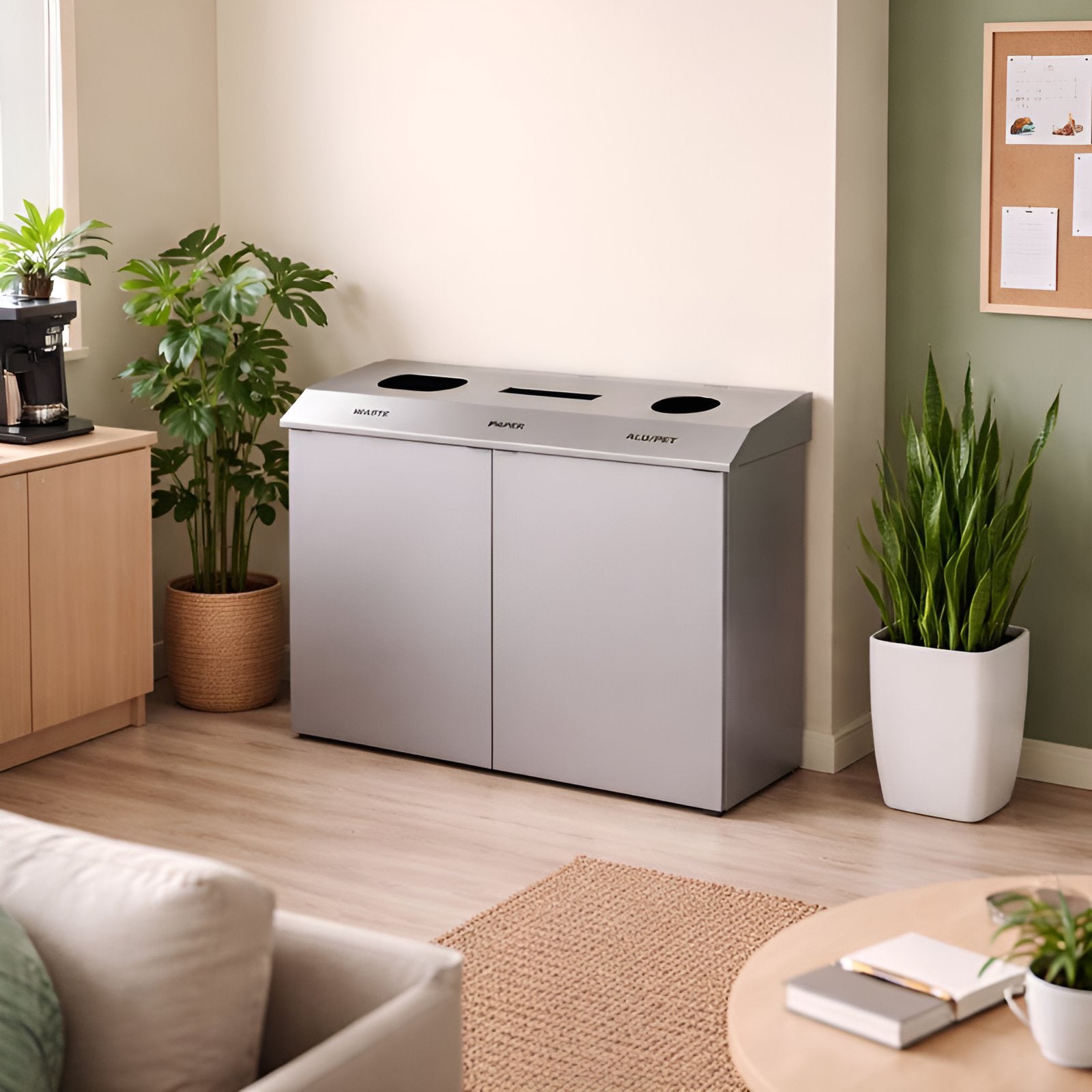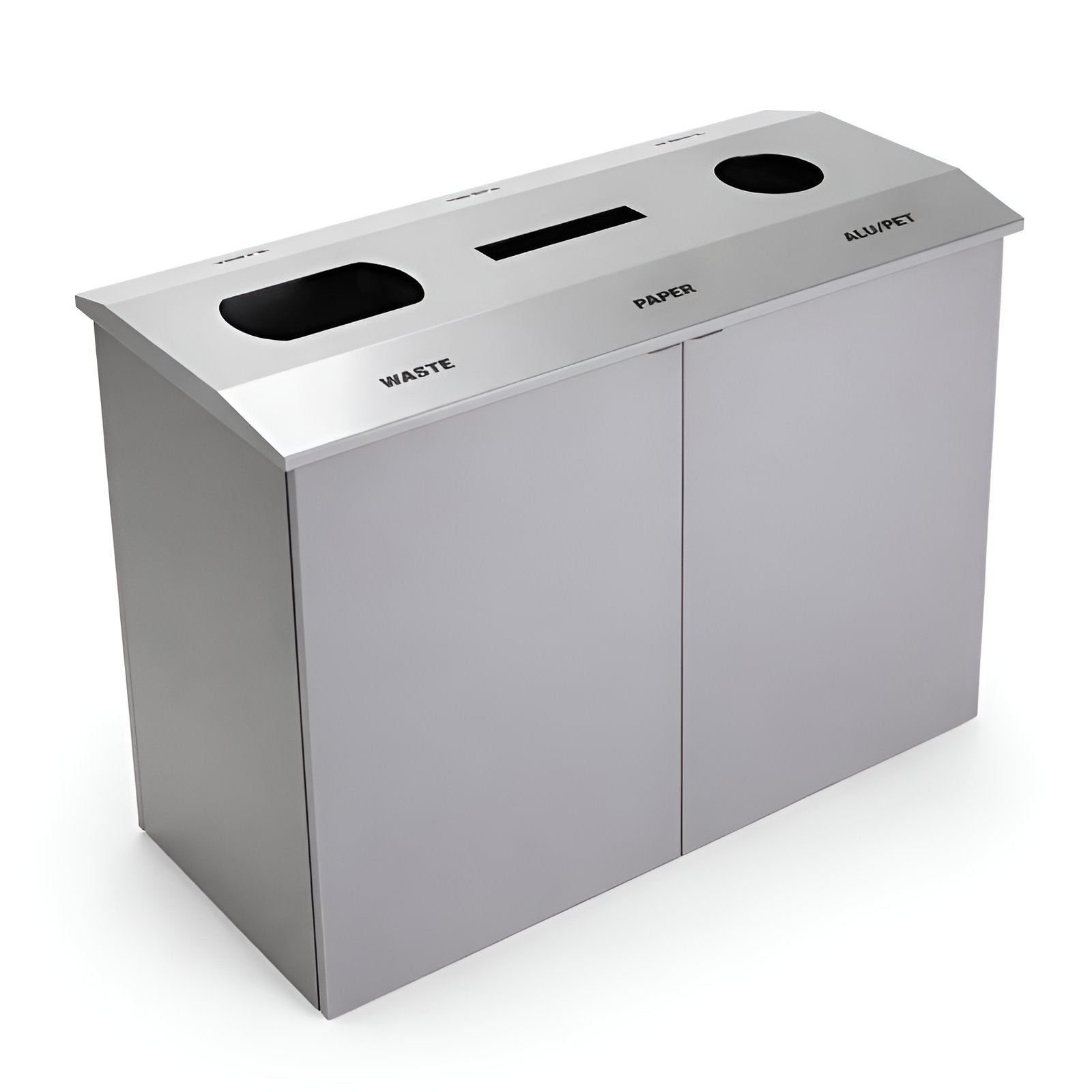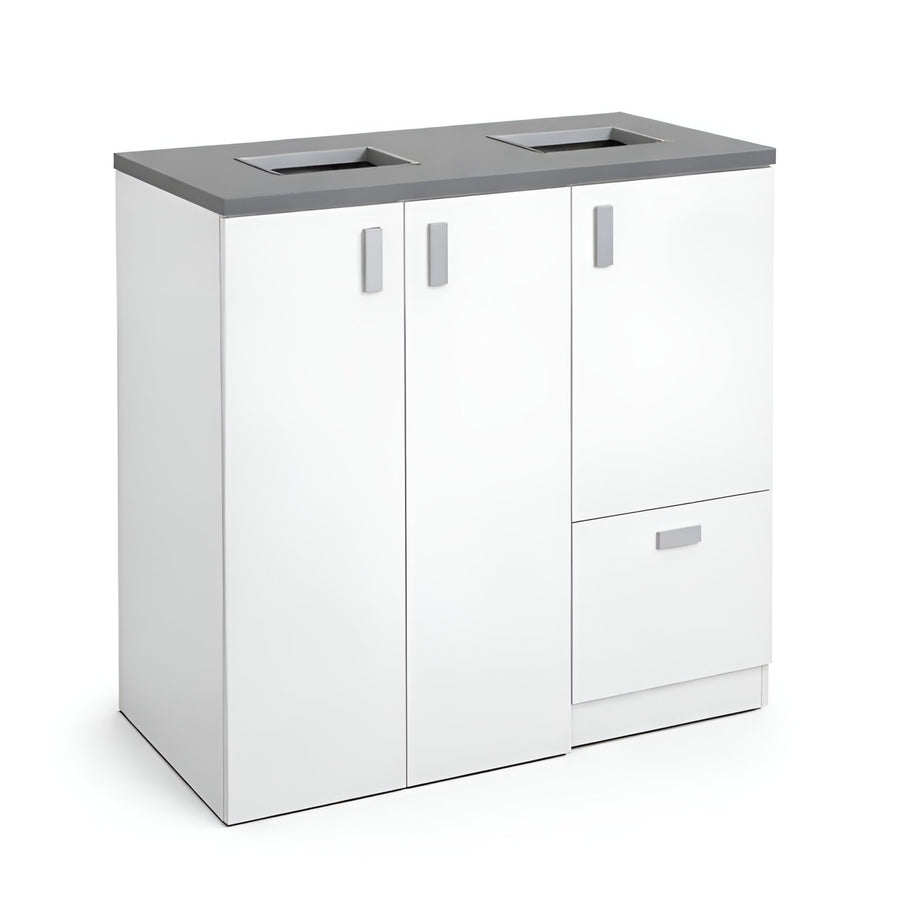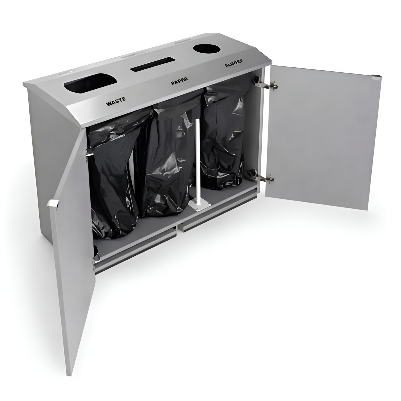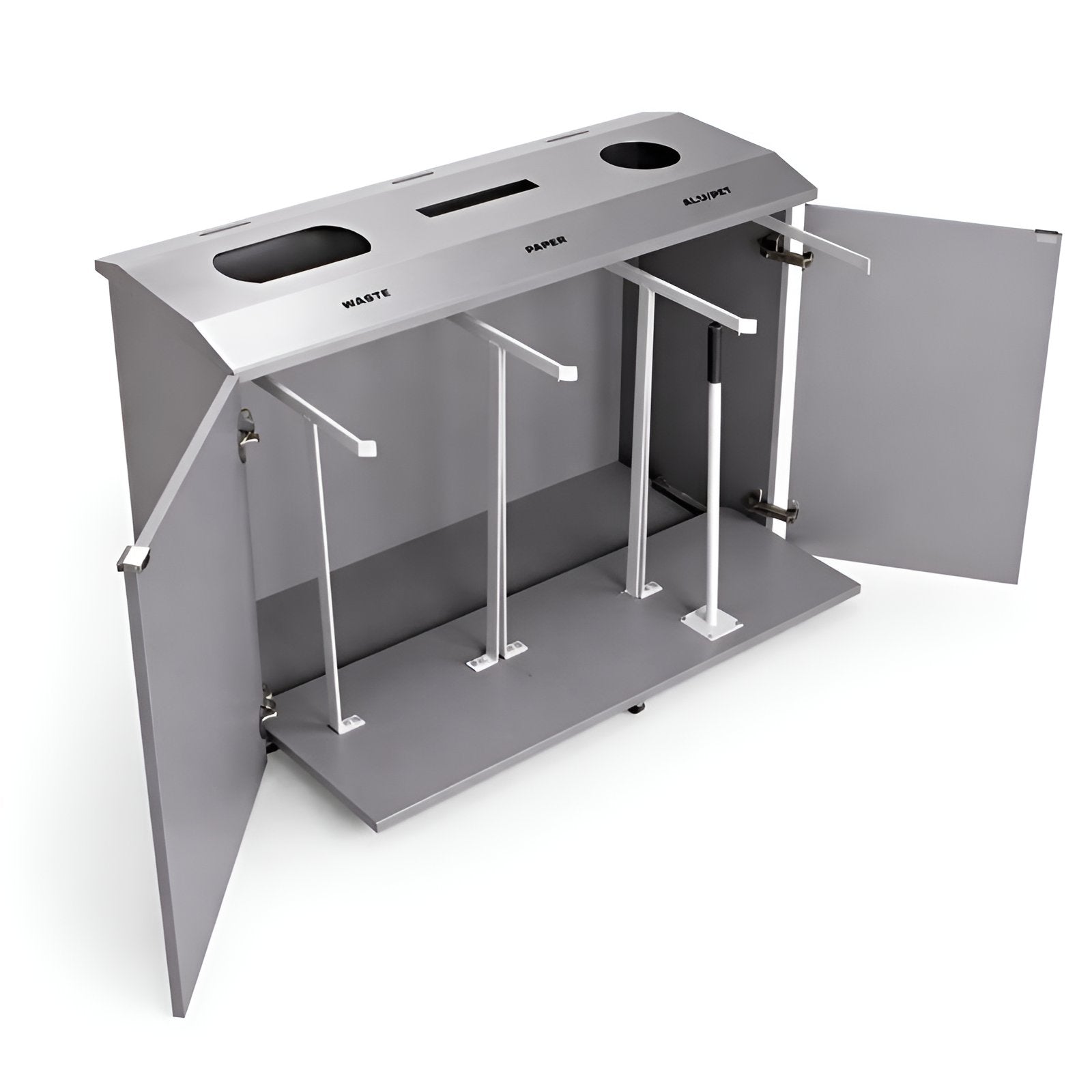 La kildesorteringen gå som en drøm med Hampton sin gjennomtenkte kildesorteringsløsning. Skapet er utviklet for effektiv sortering og enkel bruk, enten det står på kontoret, i fellesarealer eller i profesjonelle miljøer.