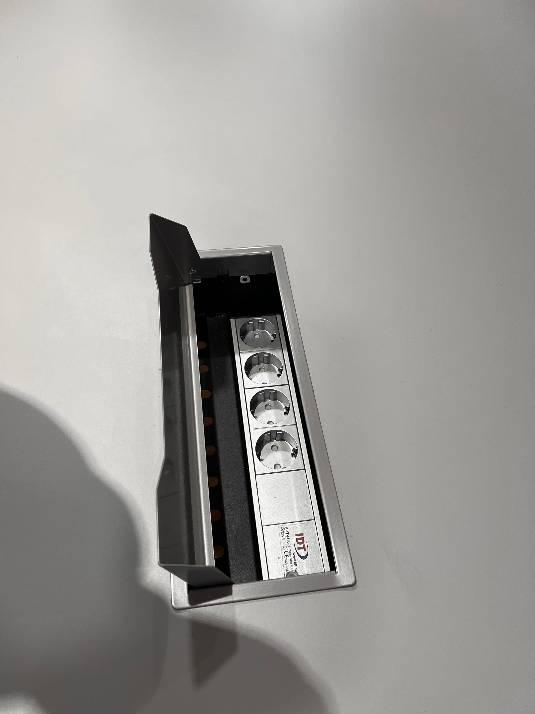 Kommer med tynne T-bein for bedre beinplass og ferdig kabel-uttak med lokk i grå inkludert grenkontakt.