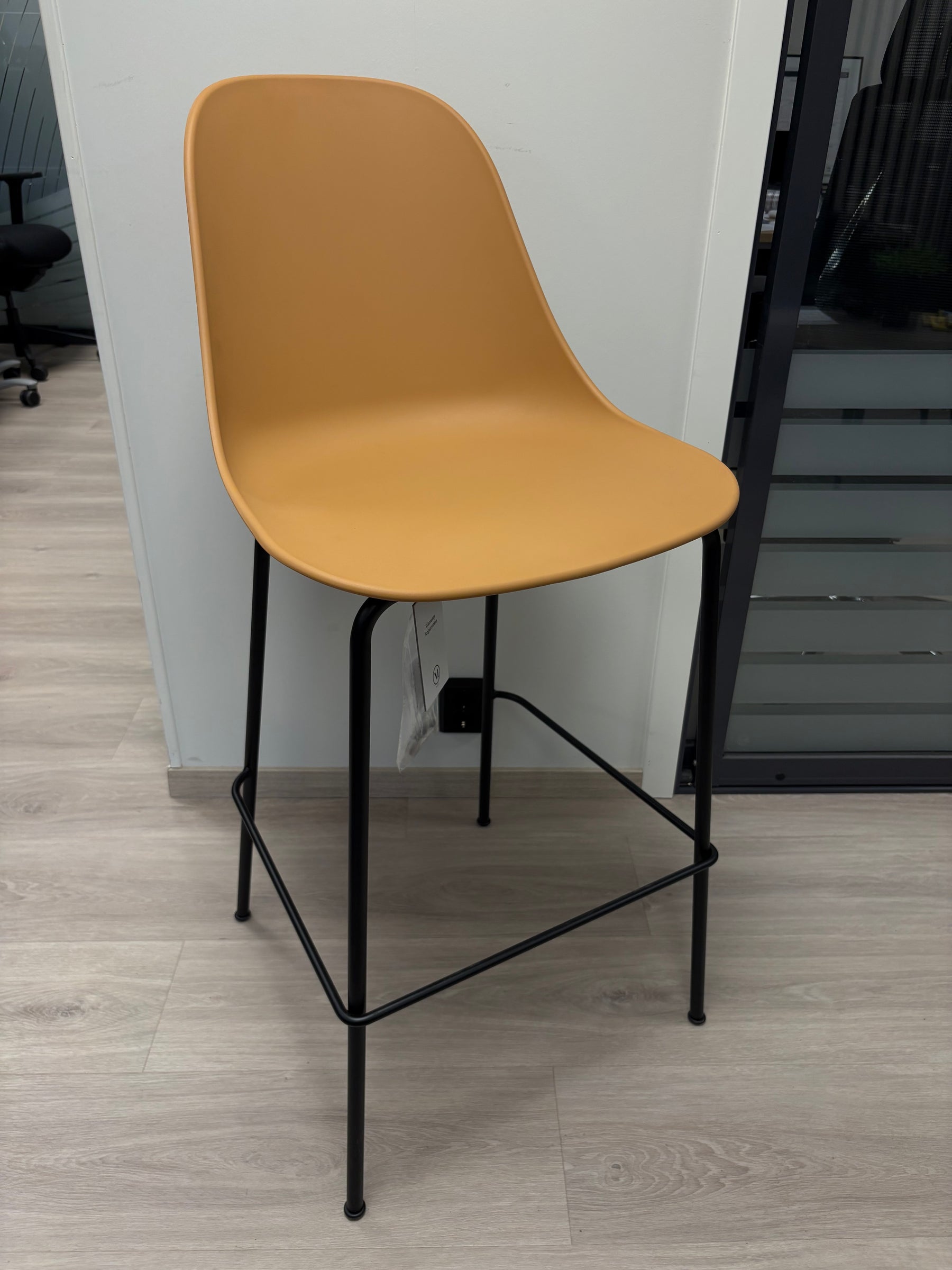 Stolen har et sete formet for komfort og støtte, med klassisk bar‑/benkehøyde og mål for å passe til standard benkbord (bredde ca. 59 cm, dybde ca. 58,5 cm, total høyde ca. 112 cm, sittehøyde ca. 73 cm). Understellet er i pulverlakkert stål med svart finish som gir stabilitet og gjør at stolen står godt på gulvet. Setet er laget med et holdbart materiale — vanligvis formstøpt plastforsterket med glassfiber (85 % polypropylen + 15 % glassfiber) — som gir god slitestyrke samtidig som det er lett og behagelig.